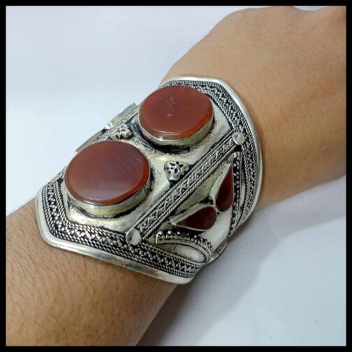 A luxurious assortment of collectible and rare, ethnic,tribal arm bands. Afghan silver engraved silver wristbands . Real silver is liked as a metal of humility. Best, exceptional ,handcrafted wristbands. Slick, delightful, customary ancestral, pounded surface and long cuff wrist bands for ladies. Blue stones makes it more appealing. Bright adornments joins new,old,metal,beads,coins,stones and texture.Afro Clubs provides you with various plans of metal sleeve popular things for party and extraordinary occasions.